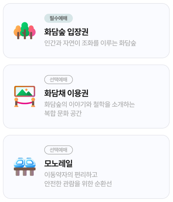 2️⃣ 입장권, 화담채, 모노레일을 한 페이지에서 구매 가능